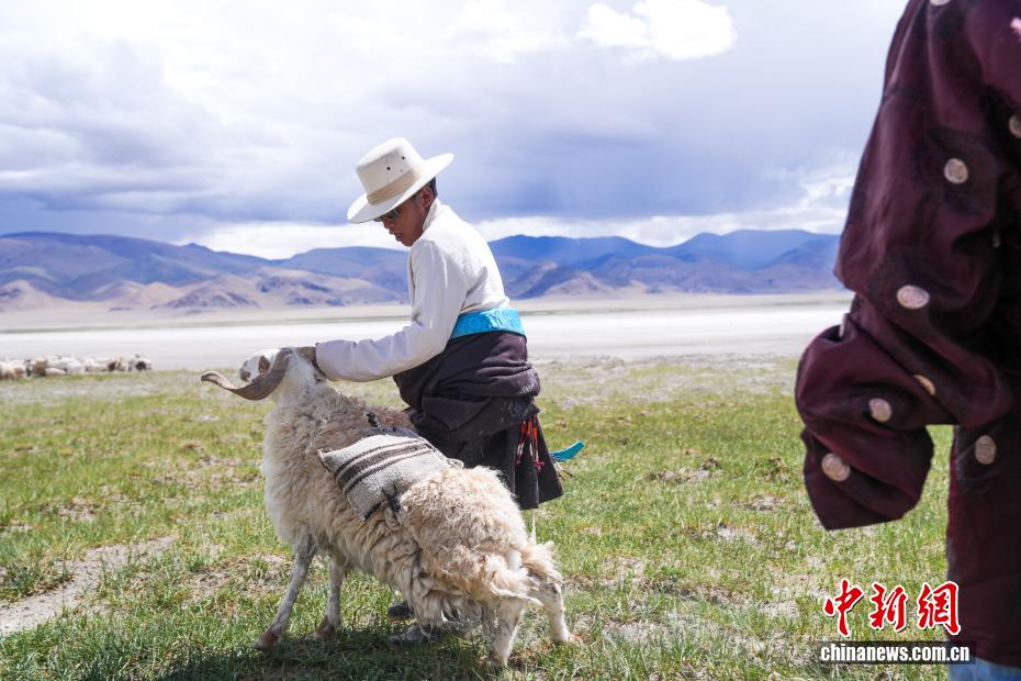 7月20日,在西藏阿里地區革吉縣鹽湖鄉,牧民從羊群中牽引一只將要馱負鹽袋的羊。一千多年前,阿里地區有50多家駐扎的鹽幫,將自然鹽用羊馱牛背邊放牧邊運輸的方式,運送到普蘭、日喀則、印度、尼泊爾等地,并用以物易物的方式換回青稞、磚茶、布料等日常生活所需的物品,從而孕育了遠負盛名的“鹽羊古道”傳奇。近年來,當地開辦粗鹽巴加工廠、打造“鹽羊古道”旅游品牌等方式,使千年“鹽羊古道”煥發新生機。中新社記者 張祥毅 攝