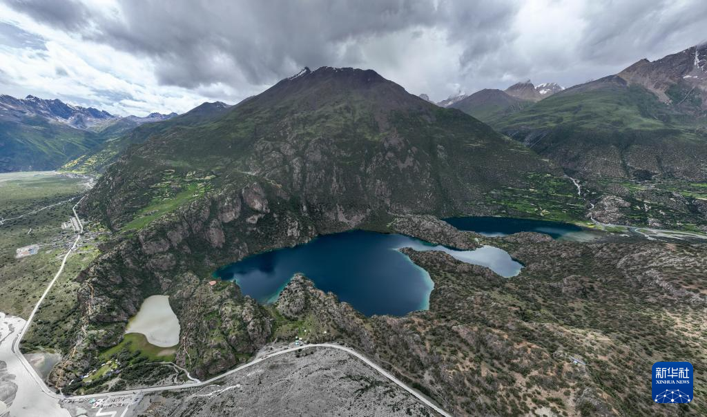空中俯瞰“三色湖”,從左到右分別為黃湖、黑湖和白湖(7月20日攝,無人機照片)。新華社記者 晉美多吉 攝