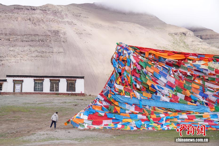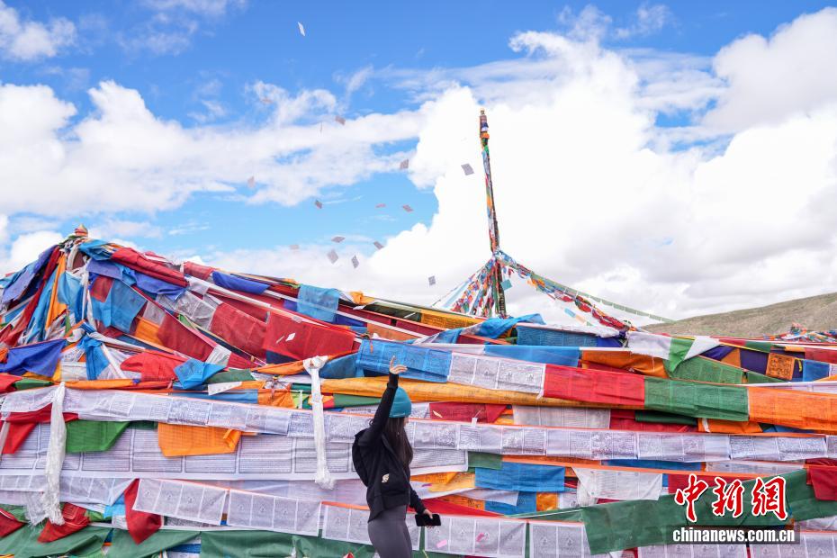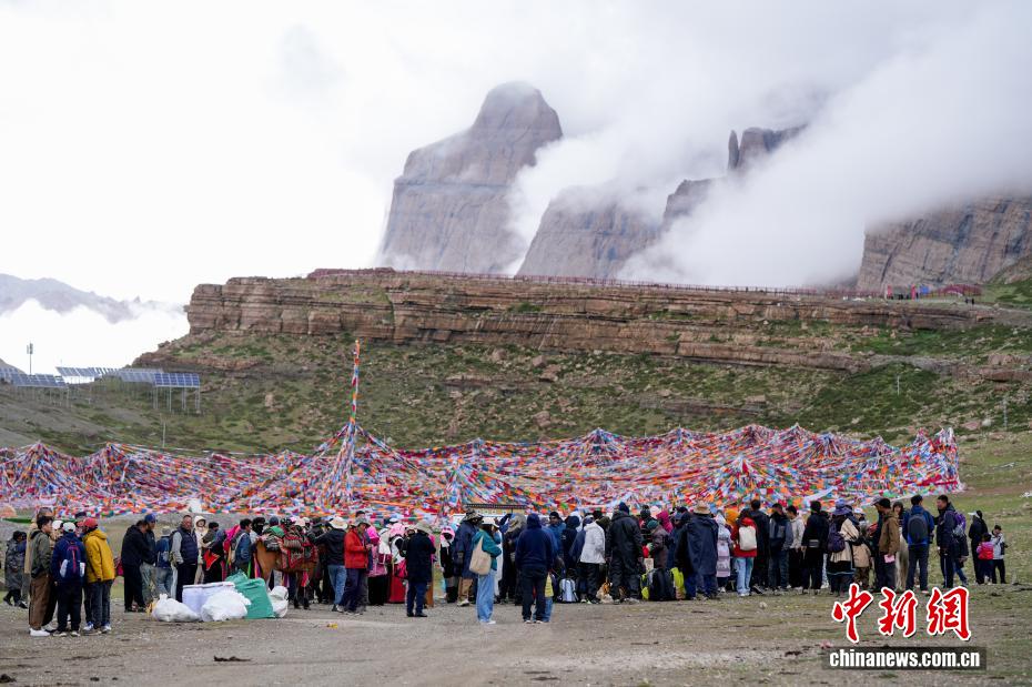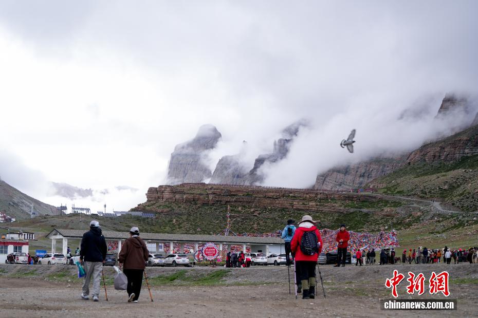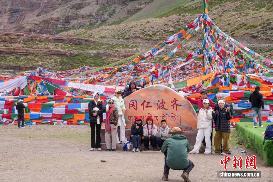 7月21日,游客在岡仁波齊山腳下的經幡廣場打卡拍照。岡仁波齊位于西藏阿里地區普蘭縣境內,是岡底斯山的主峰,也是藏傳佛教的神山之一,每年吸引眾多信徒前往轉山,并衍生出徒步旅行的經典路線。每年來自國內外的徒步旅行者為當地創造就業機會的同時,也推動了文旅產業的發展。中新社記者 張祥毅 攝