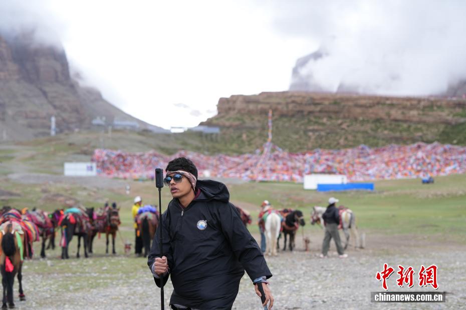 7月21日,一位來自印度的徒步旅行者在岡仁波齊山腳拍攝徒步視頻。岡仁波齊位于西藏阿里地區普蘭縣境內,是岡底斯山的主峰,也是藏傳佛教的神山之一,每年吸引眾多信徒前往轉山,并衍生出徒步旅行的經典路線。每年來自國內外的徒步旅行者為當地創造就業機會的同時,也推動了文旅產業的發展。中新社記者 張祥毅 攝