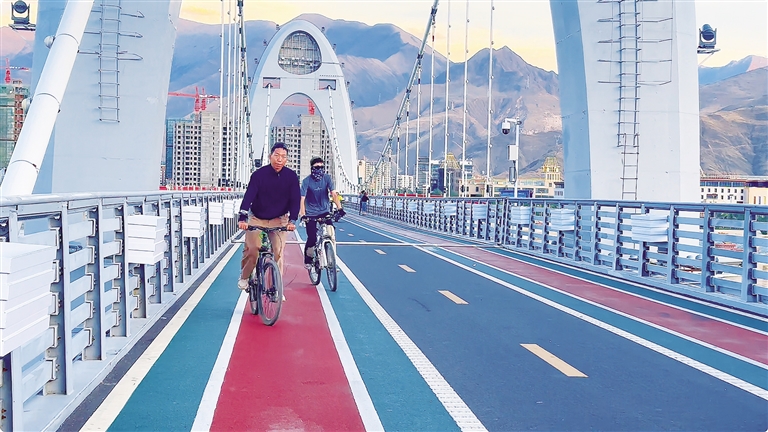 拉薩河畔的公園“綠色騎行帶”,已成為城市休閑健身的亮眼新地標。這條綠色廊道沿河岸蜿蜒延伸,將沿線多個生態公園與地標景點串聯成線,其中橫跨河面的“和美橋” 以現代藏式風格的獨特設計格外吸睛,成為騎行愛好者爭相打卡的網紅地。