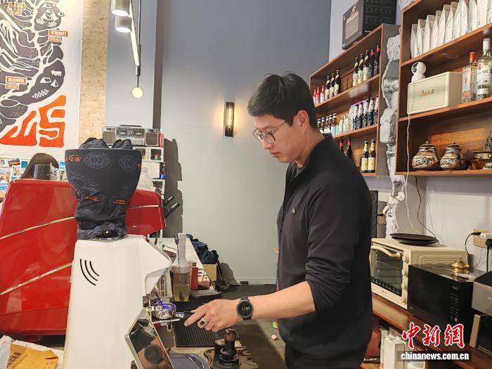 7月21日,劉博在他的店鋪內操作咖啡機。中新社記者 陳建新 攝