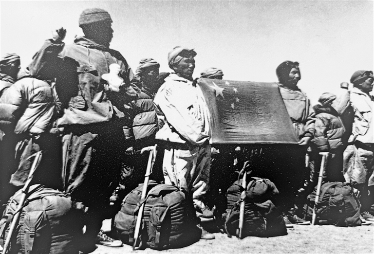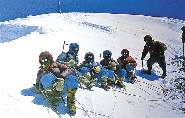 據羅則介紹,50年前,“九勇士”成功從北坡登頂珠峰之后,隨即開展了向黨和人民匯報勝利的喜訊、豎立金屬覘標測量珠峰高度、展示五星紅旗、拍攝在頂峰活動資料、搜集山頂冰雪樣品、遙測地球最高點上的人類心電圖、測量峰頂上的覆雪深度、采集峰頂花崗巖石標本、拍攝頂峰全景的電影、把毛主席石膏塑像安放在峰頂上、為登頂勇士拍攝紀念照片11項工作。