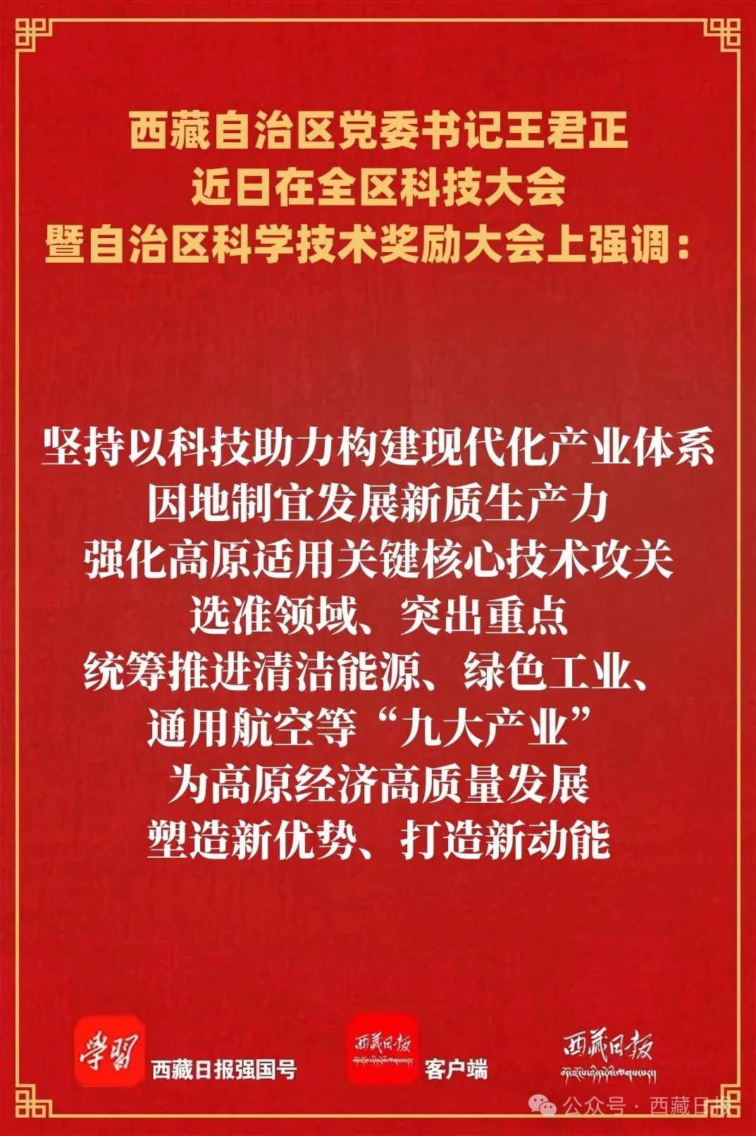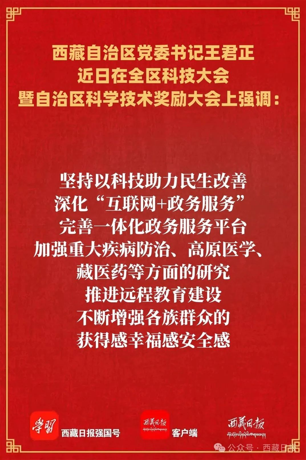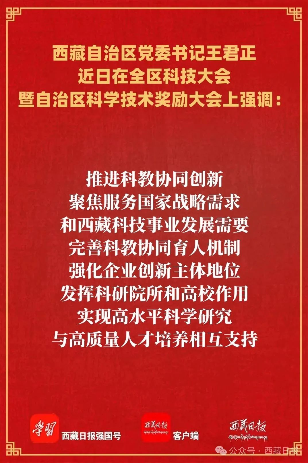 近日,全區科技大會暨自治區科學技術獎勵大會在拉薩召開,自治區黨委書記王君正出席并講話。他強調,要深入貫徹落實習近平總書記關于科技創新、西藏工作的重要指示和新時代黨的治藏方略,加快推動科技事業發展,為社會主義現代化新西藏建設提供堅實科技支撐。