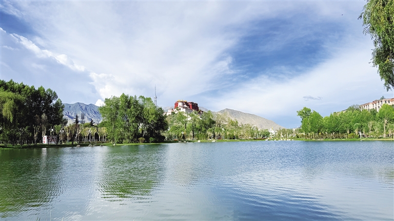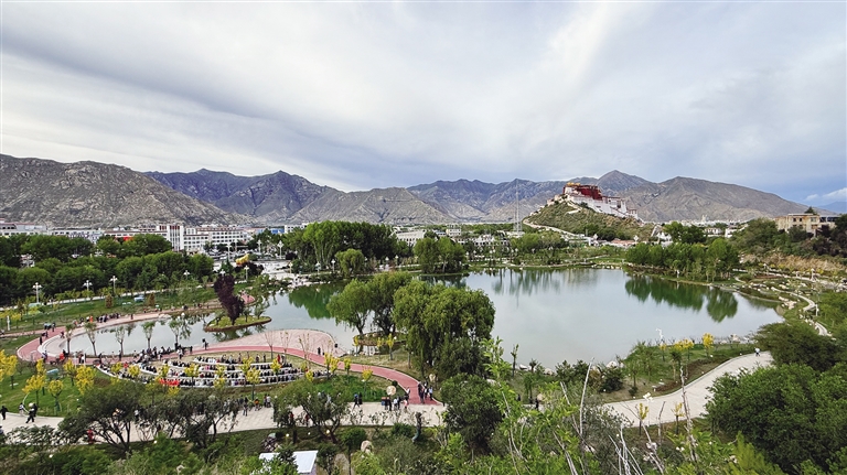 拉薩團結公園坐落于布達拉宮西麓、藥王山腳下。昔日,這里房屋高低錯雜、線纜交錯密布、市場喧鬧擁擠、環境喧囂擾攘,不僅影響城市形象和生態環境,還影響出行游玩體驗。如今,湖水如碧綢般清澈,岸邊綠樹成蔭,各類花卉競相綻放,昔日雜亂之地已蛻變為翡翠明珠,人文古跡與自然景致相映成趣,共同繪就出“百澤繞城·水城相依”的生態文明畫卷。