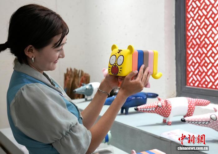 8月6日,拉薩市蓮華之寶中華藏瓷文化旅游體驗園景區里,工作人員展示卡通陶瓷工藝制品。蓮華之寶中華藏瓷文化旅游體驗園景區集展覽、銷售與文化體驗于一體,通過與高校開展校企合作等方式,將唐卡繪畫藝術與陶瓷工藝結合,傳播優秀傳統文化。中新社記者 李林 攝