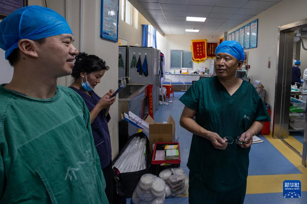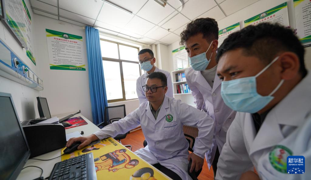 福建省泉州市惠安縣醫院援藏外科醫生張聰林(左二)和安溪縣醫院援藏外科醫生鄭毓能(左一)在和西藏昌都市洛隆縣醫院醫生巴桑扎西(右二)和格桑多布杰(右一)商討患者病情。新華社記者 晉美多吉 攝