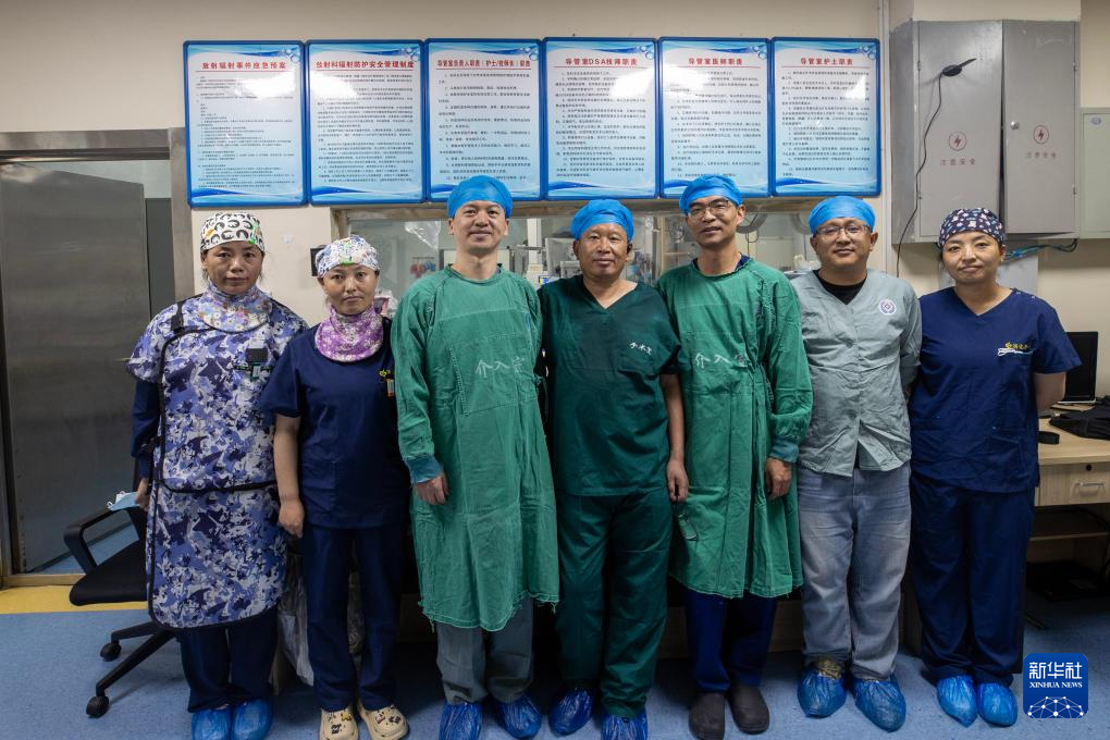 協和醫院第十批援藏醫生王強(左四)、第十一批援藏醫生蔣青偉(左三)和西藏自治區人民醫院醫生扎西(左一)在拉薩為患者施行內鏡逆行胰膽管造影術(8月5日攝)。新華社記者 姜帆 攝