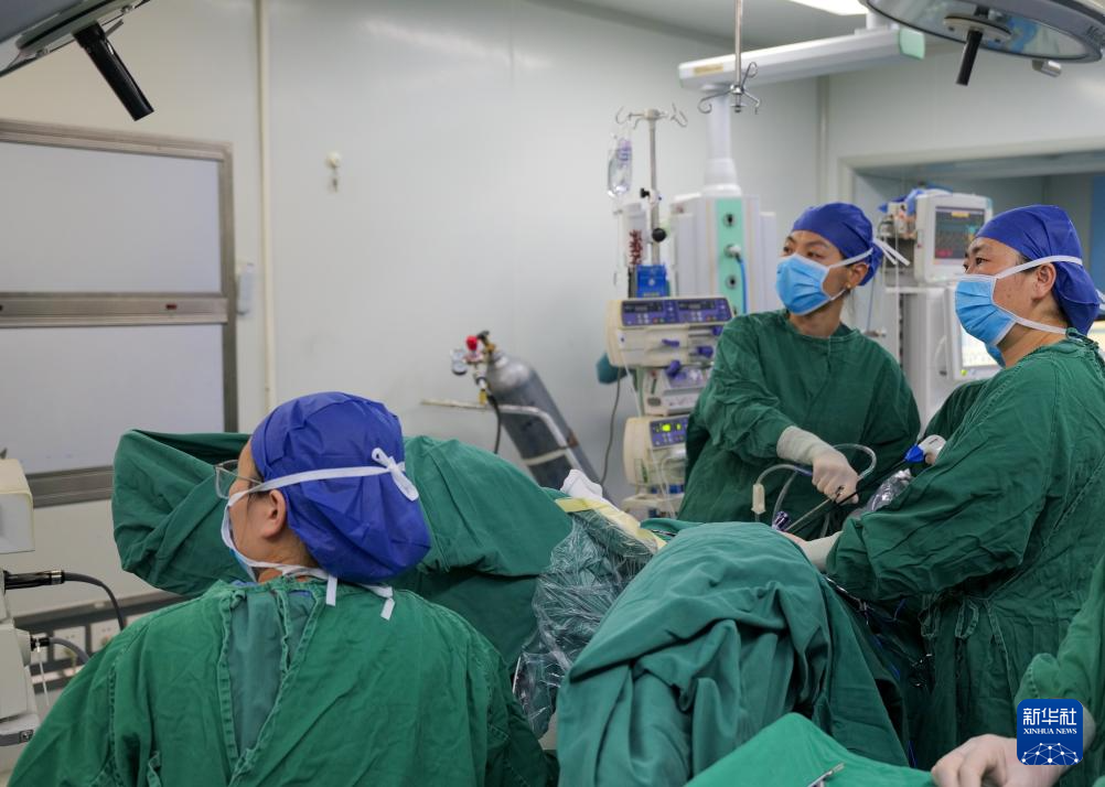 北京大學人民醫院第十批援藏婦科醫生張果(中)與西藏自治區人民醫院醫生李芳(左)一起為患者做手術(8月4日攝)。新華社發(柑丹鴦琦攝)