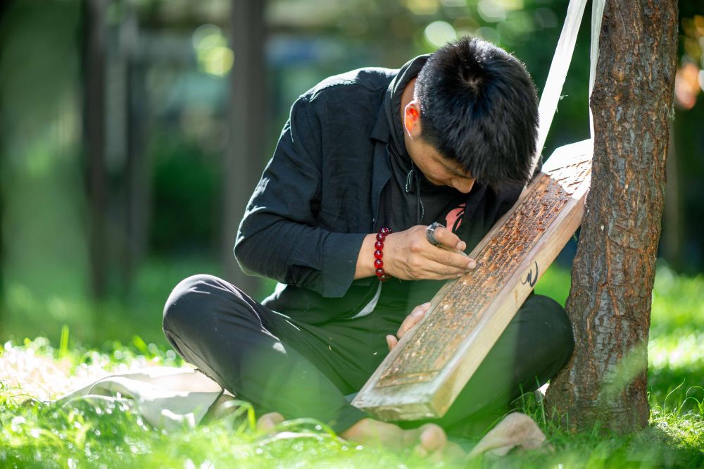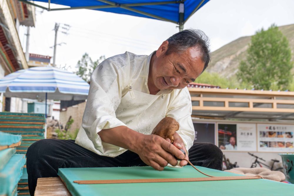 這是一名傳承西藏傳統雕刻修復技藝的雕刻師(8月6日攝)。西藏傳統雕刻修復技藝入選西藏自治區級非物質文化遺產代表性項目名錄。