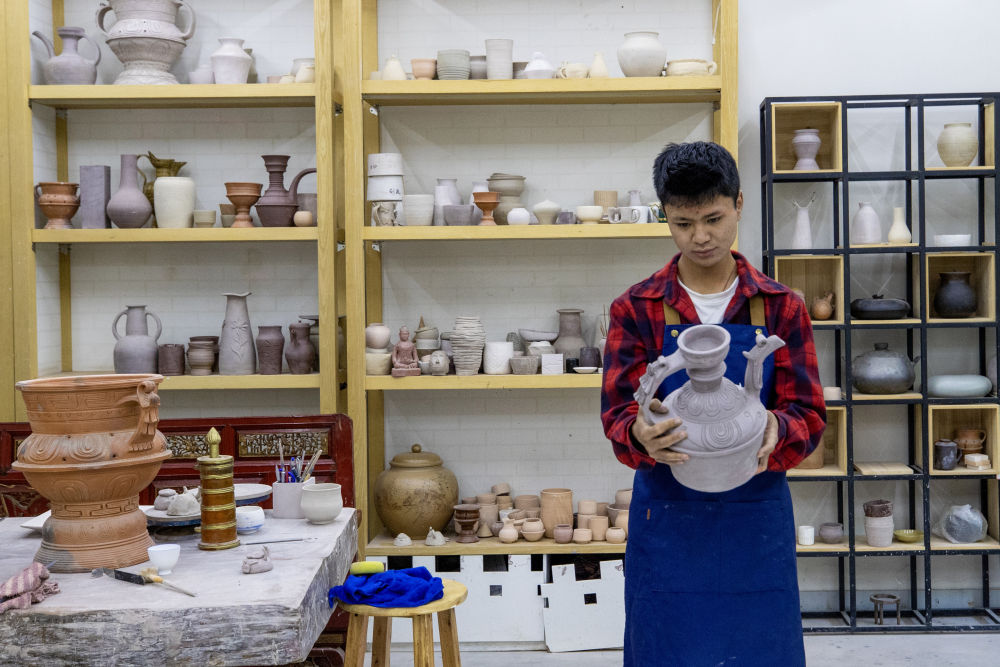 8月6日,一名制陶師在制作陶器。藏族傳統泥陶雕塑制作技藝入選西藏自治區級非物質文化遺產代表性項目名錄。