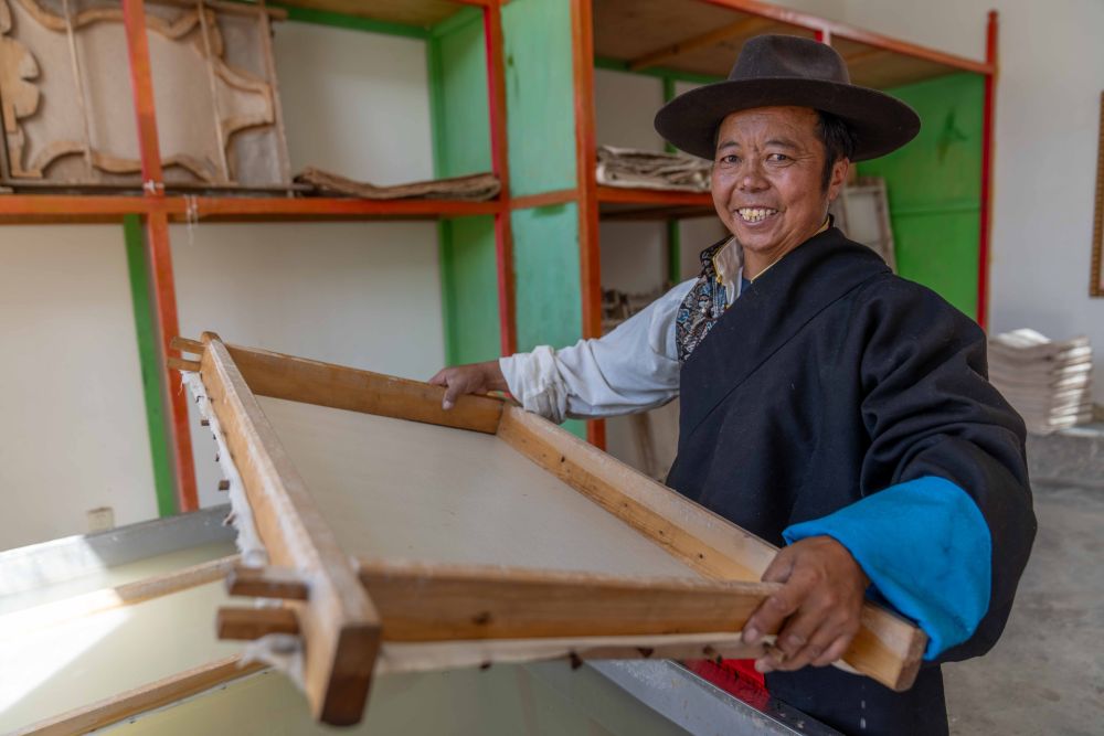 8月12日,雪拉藏紙制作技藝自治區級代表性傳承人格桑旦增在制作藏紙。