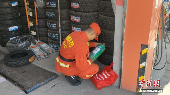 圖為消防隊員正在仔細檢查店內消防器材是否完好有效。林芝市森林消防支隊供圖