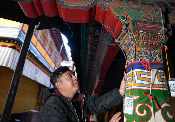 布達拉宮監測中心的工作人員旦增旺堆巡查布達拉宮木結構傳感器設備(2024年12月4日攝)。新華社記者 晉美多吉 攝