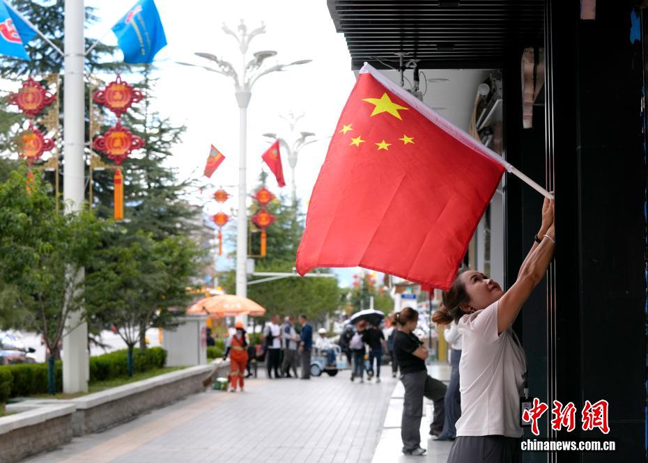 8月19日,隨著西藏自治區成立60周年慶祝活動臨近,拉薩氛圍濃。拉薩街頭,處處是張燈結彩的盛景,洋溢著一派祥和與歡騰的氛圍。圖為拉薩北京中路商鋪懸掛國旗。中新社記者 李林 攝