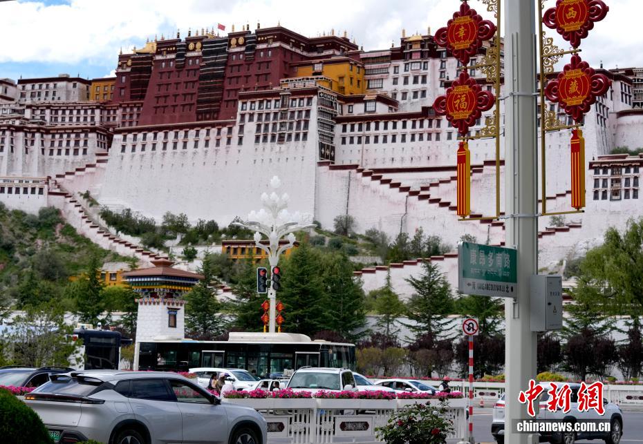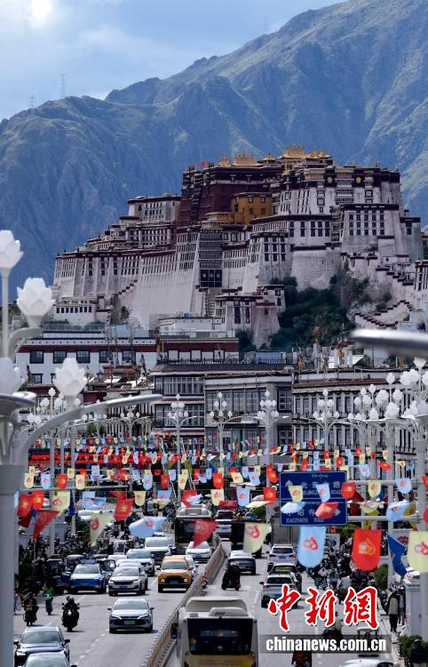8月19日,隨著西藏自治區成立60周年慶祝活動臨近,拉薩氛圍濃。拉薩街頭,處處是張燈結彩的盛景,洋溢著一派祥和與歡騰的氛圍。圖為拉薩裝扮一新的街頭。中新社記者 李林 攝