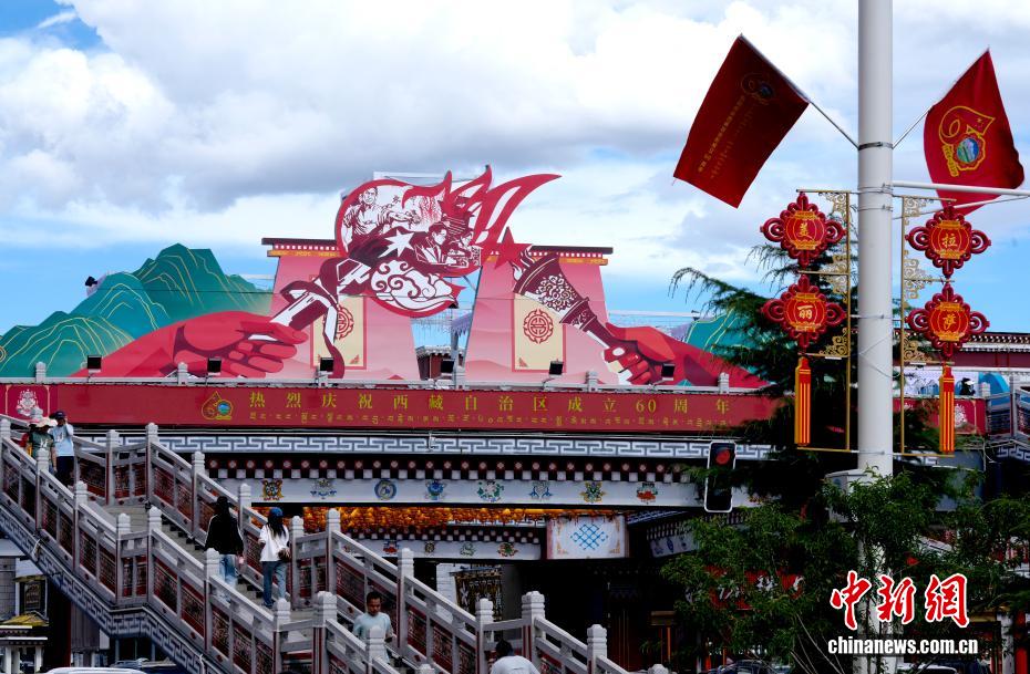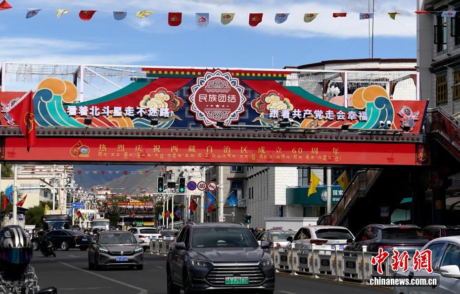 8月19日,隨著西藏自治區成立60周年慶祝活動臨近,拉薩氛圍濃。拉薩街頭,處處是張燈結彩的盛景,洋溢著一派祥和與歡騰的氛圍。圖為拉薩裝扮一新的人行天橋。中新社記者 李林 攝