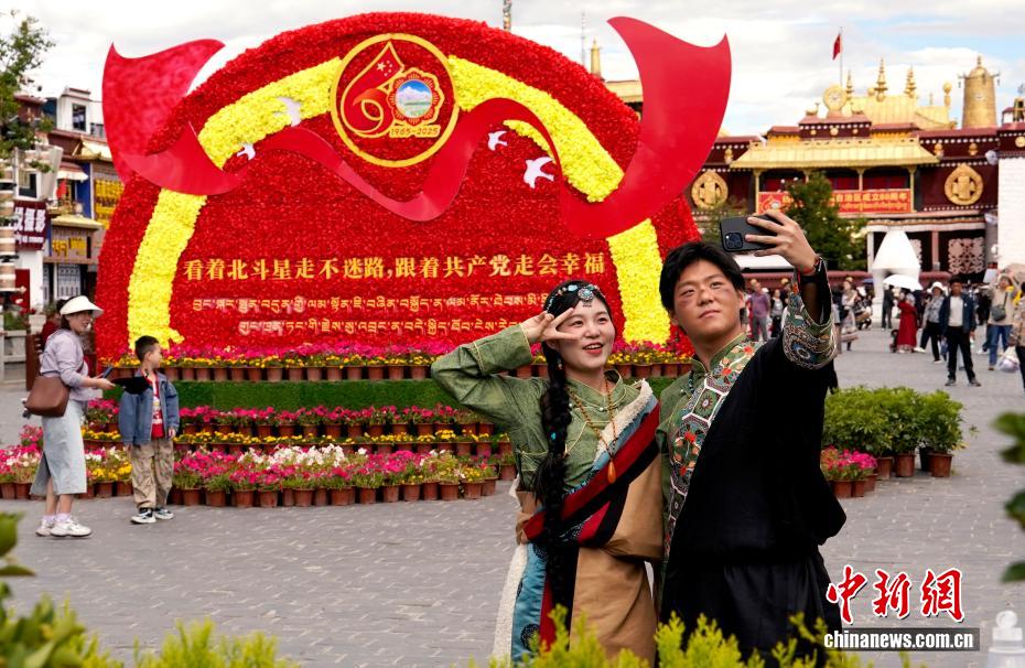 8月19日,隨著西藏自治區成立60周年慶祝活動臨近,拉薩氛圍濃。拉薩街頭,處處是張燈結彩的盛景,洋溢著一派祥和與歡騰的氛圍。圖為游客在拉薩大昭寺廣場上的大慶宣傳標語前留念。中新社記者 李林 攝