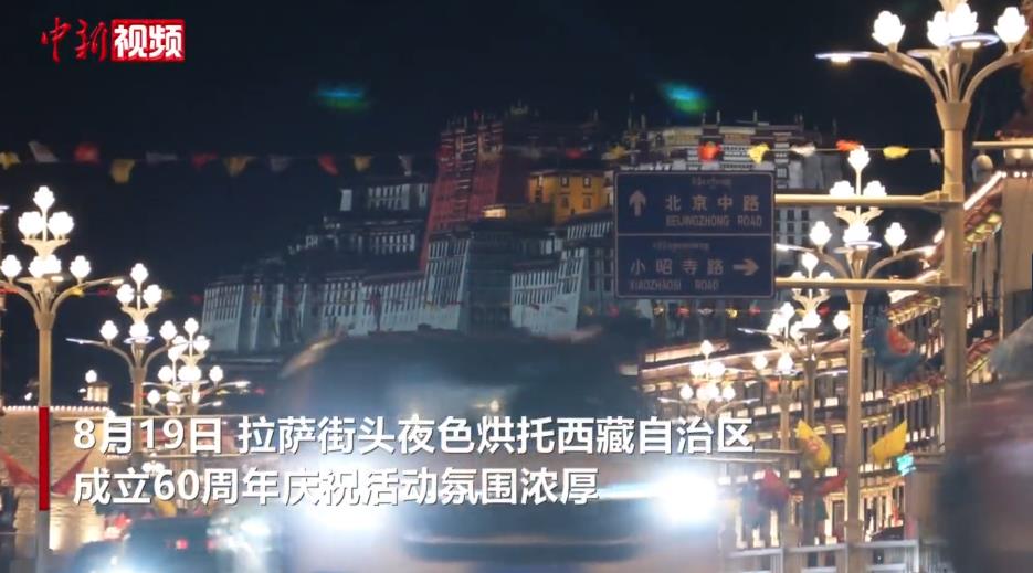8月19日,拉薩街頭夜色烘托西藏自治區(qū)成立60周年慶?;顒臃諊鷿夂?。隨著西藏自治區(qū)成立60周年慶祝活動臨近,拉薩街頭彩旗飄揚、人行天橋裝扮一新、燈光秀炫彩奪目,處處洋溢著一派祥和歡慶的氣氛。(李林 旦增卓瑪 制作 王嘉怡)