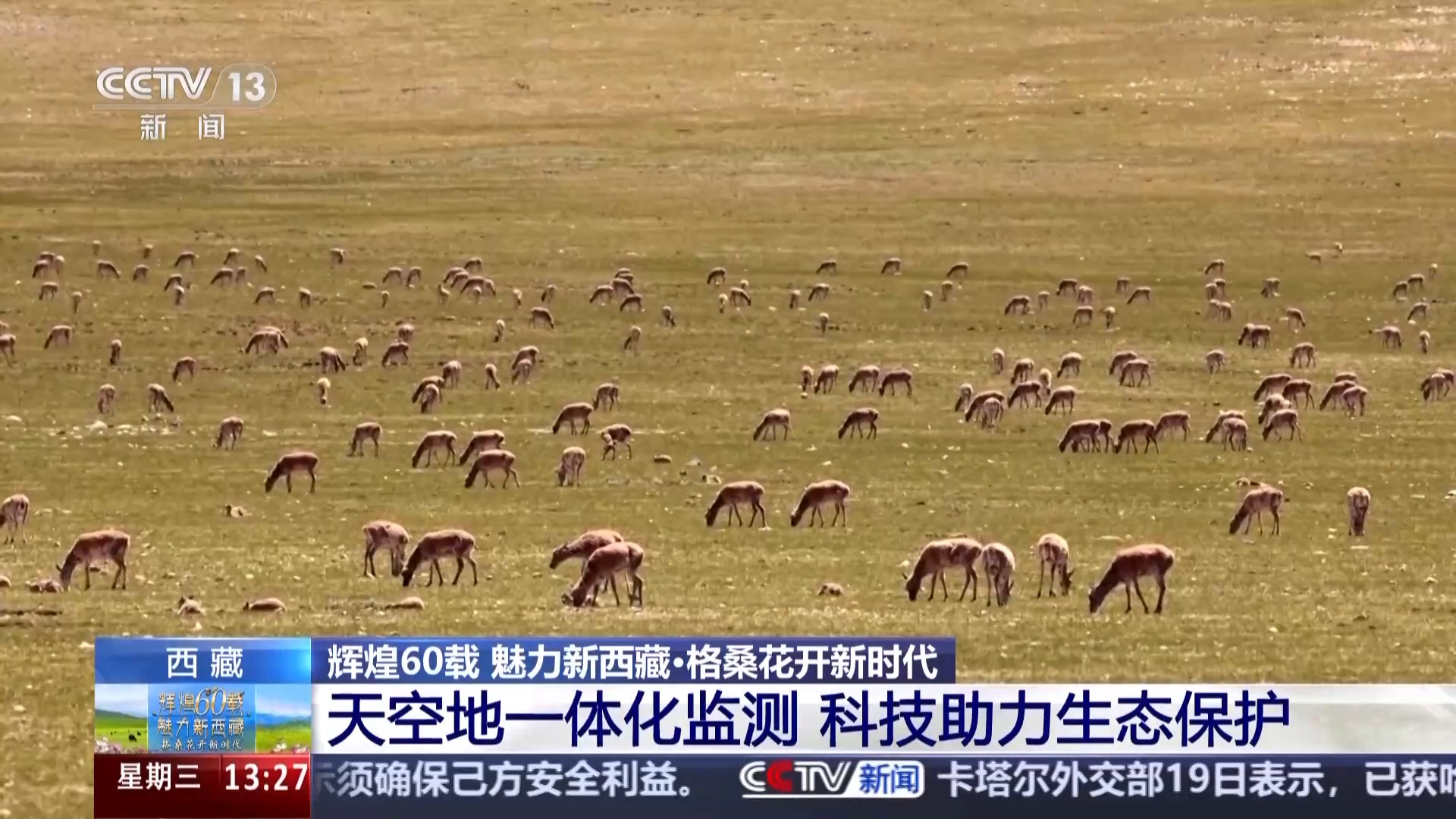 總臺記者 盧柯宇:這里是三江源國家公園唐北區域,這片遼闊壯美的土地,正是我身邊的藏羚羊的棲息地,也是青藏高原第二大藏羚羊產仔地。每年這個時節,都是它們為繁衍后代而集聚、進行遷徙的關鍵時刻。