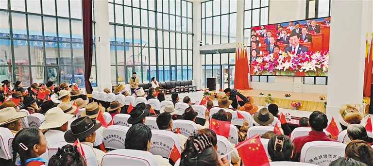 海拔5373米的浪卡子縣普瑪江塘鄉干部群眾通過多種形式收聽收看大會盛況,共同見證這一重要的歷史時刻。普瑪江塘鄉黨委書記多吉旺久說:“60年來,普瑪江塘鄉從過去靠天吃飯到如今靠科技吃飯,巨大的變化離不開黨中央的親切關懷和黨的民族政策,我們一定銘記黨的恩情,永遠聽黨話、感黨恩、跟黨走。”