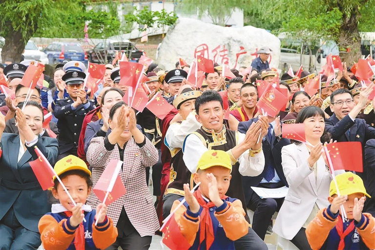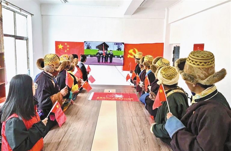 山南市隆子縣玉麥鄉干部群眾、派出所民警等來到愛國守邊先進事跡展館,集中收聽收看了慶祝大會直播。玉麥村的大學生尼瑪次仁說:“當看到山南彩車上‘家是玉麥,國是中國’的標語時,我感到非常驕傲與自豪。作為新時代青年,我要傳承好發揚好愛國守邊精神,時刻準備著到祖國和人民最需要的地方去。”
