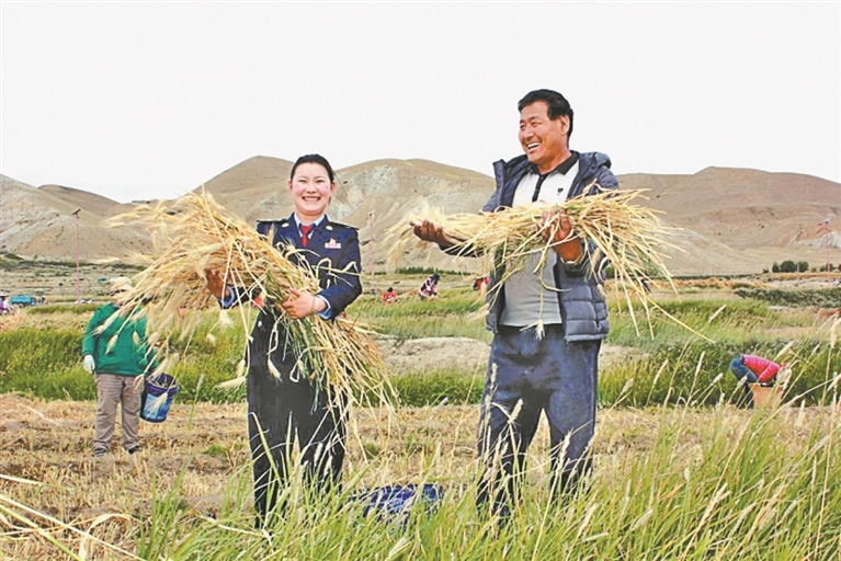 圖為阿里地區(qū)稅務(wù)干部在幫農(nóng)民收獲青稞。