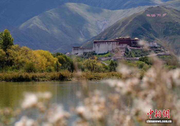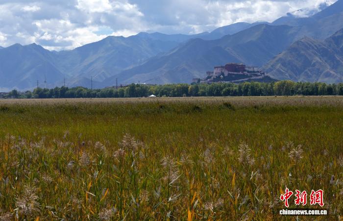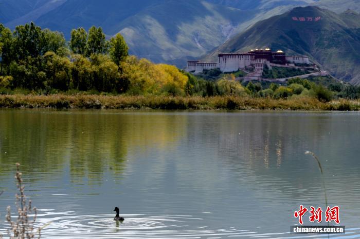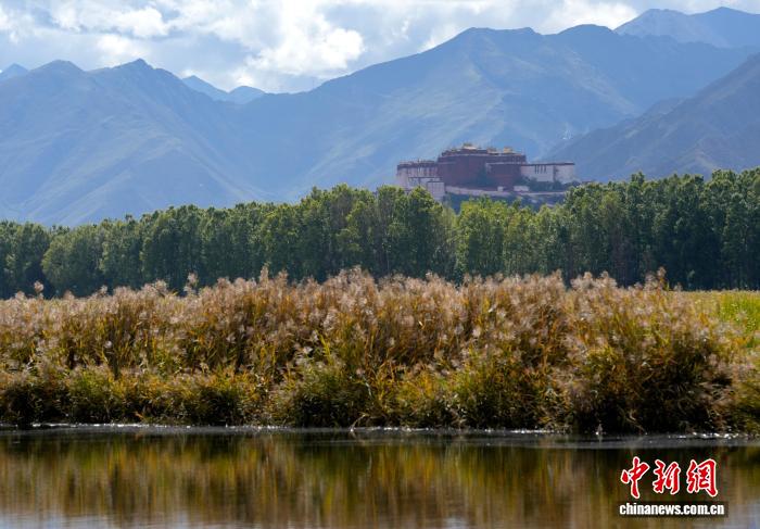 9月4日,初秋時節的西藏拉薩市拉魯濕地國家級自然保護區秋意漸濃、景色如畫。藍天白云下,草木黃綠、水鳥嬉戲,與遠處的城市建筑共同構成一幅美麗的生態畫卷。中新社記者 李林 攝