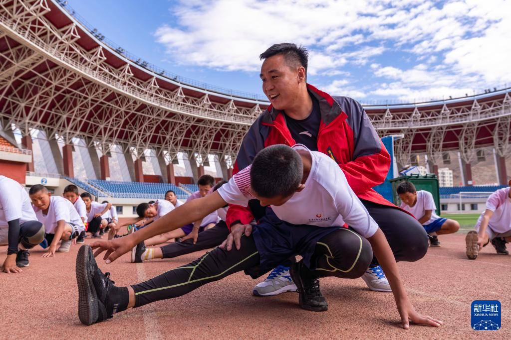 資料圖片:2019年6月22日,摔跤奧運冠軍張小平和競走奧運冠軍王麗萍在西藏自治區拉薩市文化體育中心為拉薩市業余體校的小運動員們上了一節訓練課。圖為拳擊奧運冠軍張小平正在指導小運動員的壓腿動作。新華社記者 孫非 攝