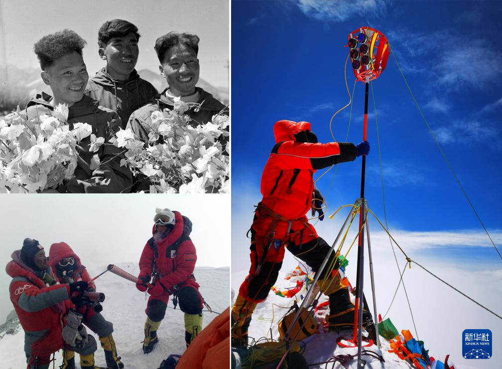 拼版照片:左上圖為1960年5月登上珠穆朗瑪峰頂的中國登山隊隊員王富洲(右)、貢布(中)和屈銀華(資料照片 新華社發);左下圖為2008年5月8日,北京奧運圣火珠峰傳遞登山隊隊員羅布占堆(左)點燃第一棒火炬手吉吉手中的“祥云”火炬(新華社發);右圖為2020珠峰高程測量登山隊隊員在珠穆朗瑪峰峰頂開展測量工作(2020年5月27日新華社特約記者扎西次仁攝)。新華社發