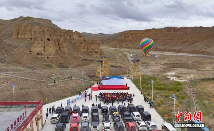 9月1日,參加“天上阿里·云巔自駕”活動的游客在札達縣霞義溝土林景區參加開幕式(無人機照片)。閆志國 攝