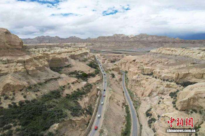 圖為9月2日,參加“天上阿里·云巔自駕”活動的游客車隊行駛在札達縣土林景區(無人機照片)。閆志國 攝