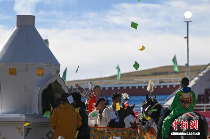 圖為恰青賽馬節傳統大跑決賽前參賽選手拋灑“隆達”(風馬旗,藏族民眾的一種祈福方式)。中新社記者 貢嘎來松 攝