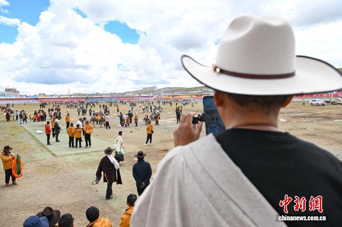 圖為當地民眾用手機直播恰青賽馬節傳統大跑決賽。中新社記者 貢嘎來松 攝