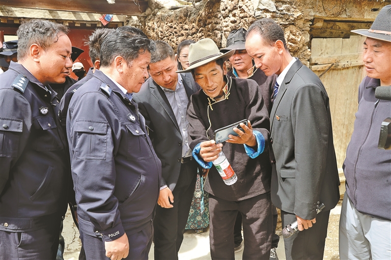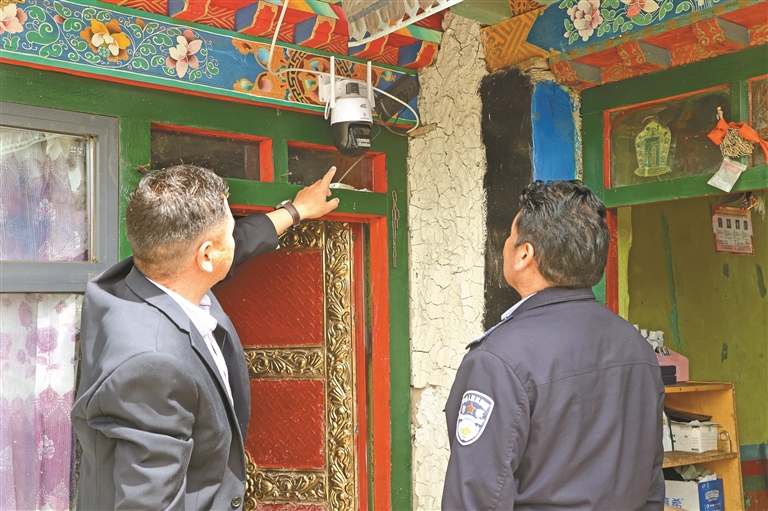 多卻鄉負責人與浪卡子縣公安局民警入戶了解家裝自衛探頭運行情況。