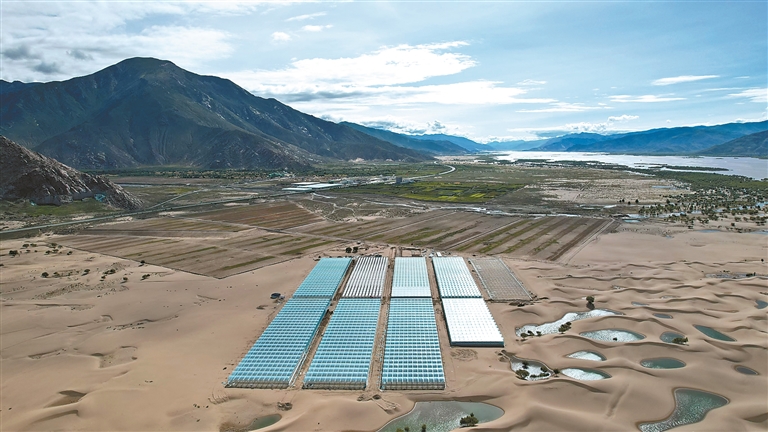 位于扎囊縣的國家農業產業化示范企業——西藏綠之源現代農業科技股份有限公司二期項目,如同一片“綠洲”鑲嵌在沙丘之中。記者 丹增平措 攝