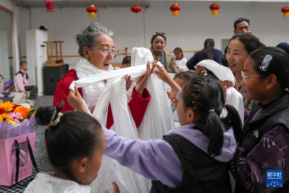 9月14日,學藏戲的孩子們在給巴桑老師獻花,送上遲到的教師節祝福。新華社記者 晉美多吉 攝