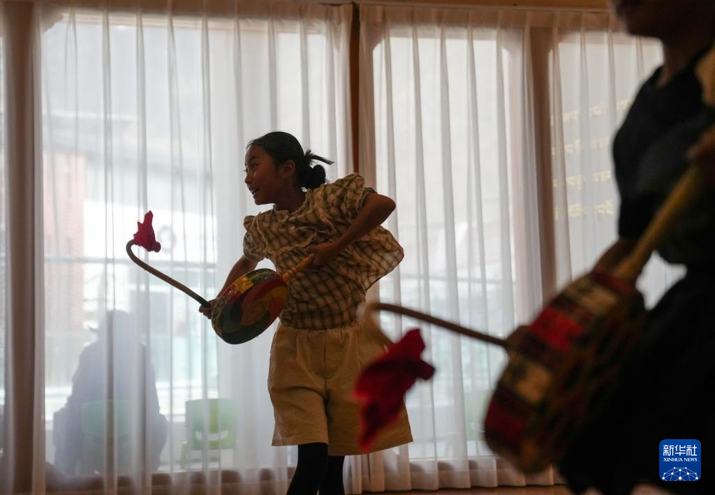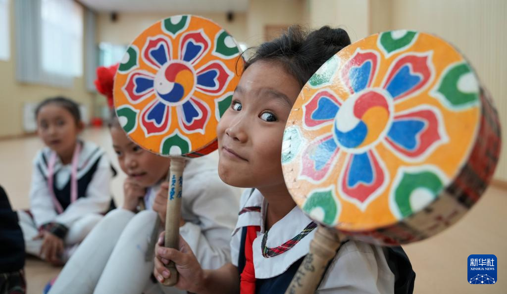 9月11日,在拉薩市實驗小學,孩子在練習熱巴舞間隙捧起繪有彩紋的熱巴鼓。新華社記者 晉美多吉 攝