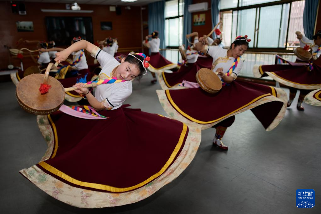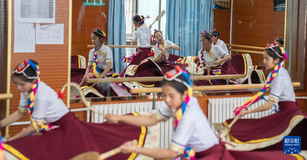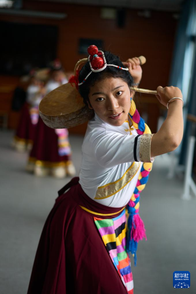 鼓點鏗鏘,彩袖飛揚。拉薩市第二中等職業技術學校的舞蹈教室內,十幾名孩子翩然跳起熱巴舞,孩子們踮腳旋轉時裙擺與彩辮翻飛,舒展而充滿力量。