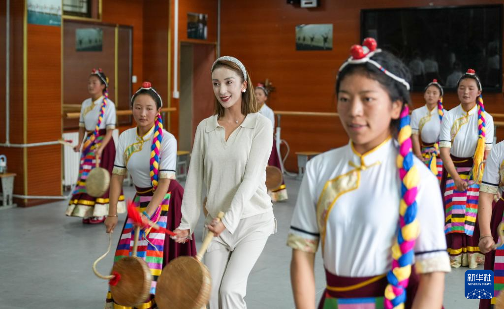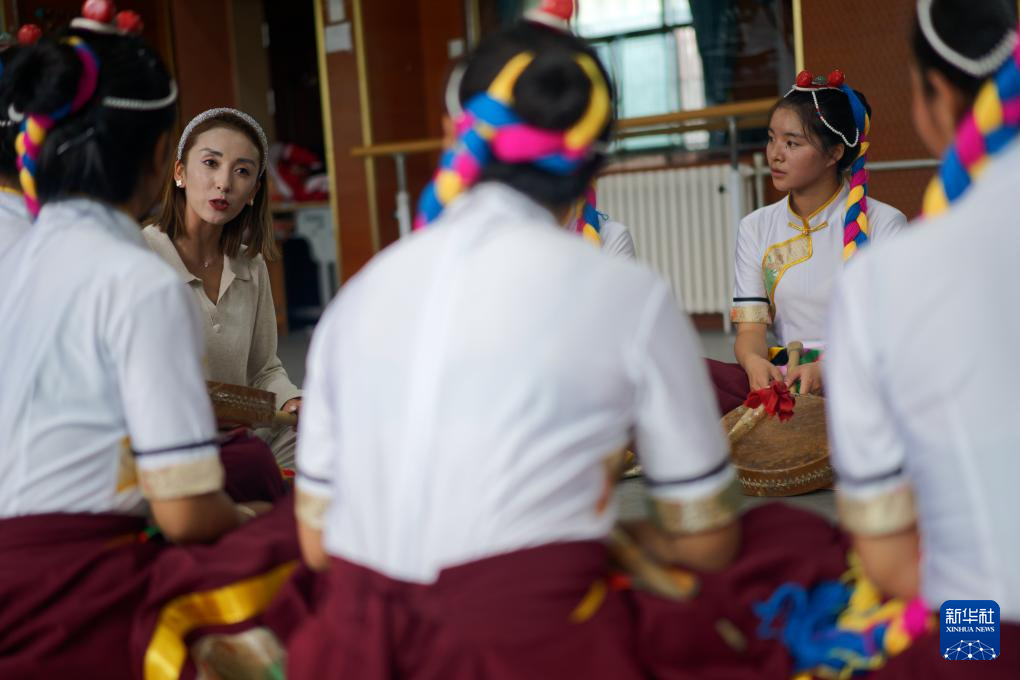 9月9日,在拉薩市第二中等職業技術學校,尼瑪卓瑪老師(右二)指導孩子們舞蹈動作。新華社記者 丁增尼達 攝