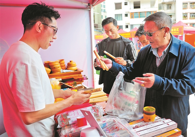 特色產(chǎn)品展銷(xiāo)柜臺(tái),市民正在選購(gòu)洛隆藏香。