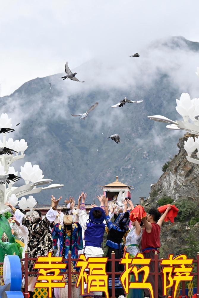 2025年8月21日上午,西藏各族各界干部群眾約2萬(wàn)人歡聚拉薩市布達(dá)拉宮廣場(chǎng),熱烈慶祝西藏自治區(qū)成立60周年。這是彩車上的演員通過(guò)布達(dá)拉宮廣場(chǎng)時(shí)放飛鴿子。新華社記者 申宏 攝