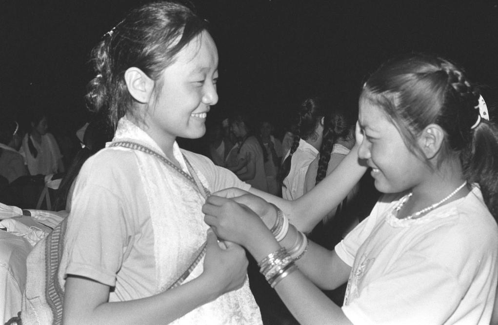 北京市西藏中學(xué)600多名高原兒女歡度藏歷水猴年新春佳節(jié)。預(yù)科二班的藏族中學(xué)生給他們的“張媽媽”——班主任張榮安老師穿上藏裝,共慶這歡樂(lè)時(shí)刻(1992年3月5日攝)。