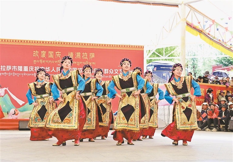 10月1日,宗角祿康公園內歌舞飛揚、歡聲雷動,“歡度國慶·情滿拉薩”拉薩市隆重慶祝中華人民共和國成立76周年群眾文藝演出在這里舉行。演出現場氣氛熱烈,富有民族特色的藏戲、傳統歌舞接連上演,歌聲、掌聲、歡呼聲此起彼伏,生動表達了拉薩各族人民對偉大祖國的美好祝愿。圖為女子舞蹈《春韻》。記者 王敏 攝