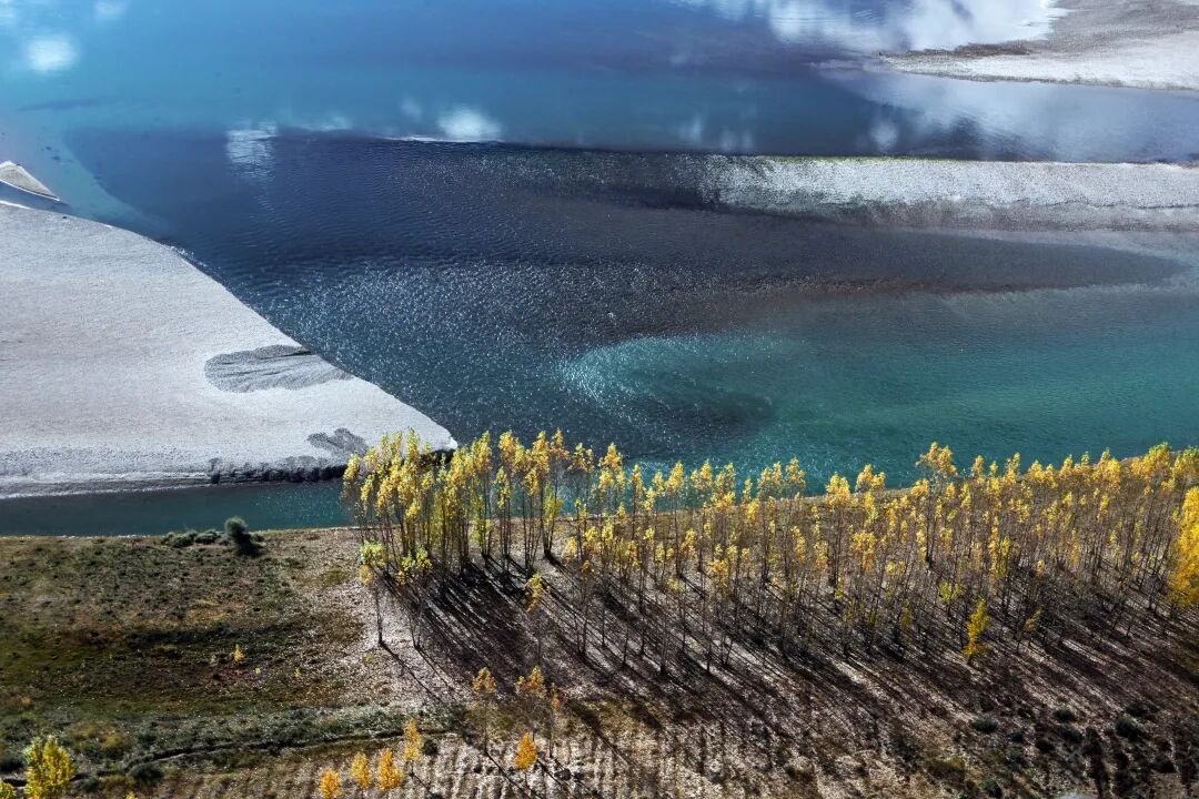 澄澈河水映著金黃楊樹林