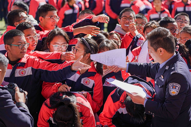 西藏“開學第一課”網絡普法進校園活動中,民警為學生發放普法宣傳知識手冊。記者 貢曲羅杰 攝