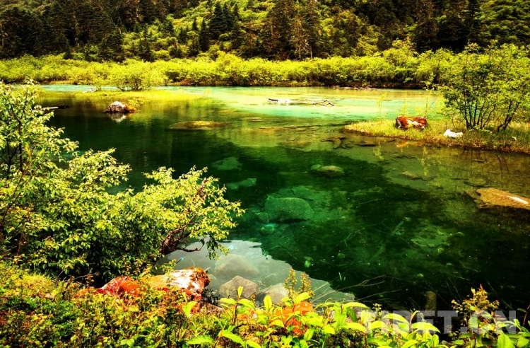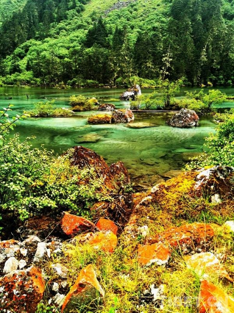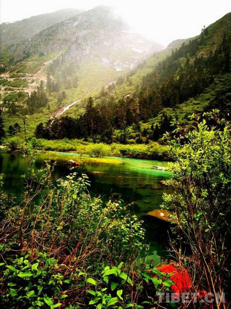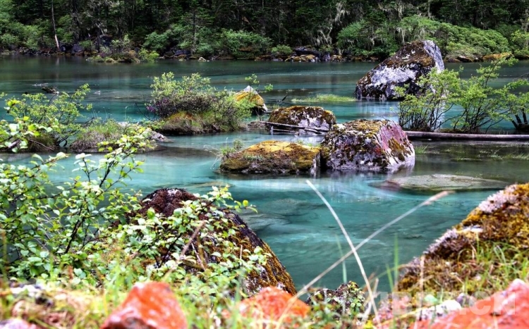 少女般的冰湖,藏于青山綠樹中,伏于深林密草內,異常迷人。站在不同的視角看冰湖,同一水域,卻有不同的顏色,綠中透著藍,藍中泛著橙、橙中映著赤、赤中蘊著黃,斑斕奪目,攝人心魄。湖水周圍的花草樹木長得異常茂盛,五光十色的倒影使湖水更加瑰麗。