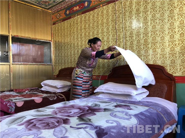回想剛剛開辦家庭旅館的日子,靦腆的金珠德吉忍不住多說了幾句,2006年,金珠德吉和丈夫在村里開起了第一家家庭旅館,那時候房子還是土坯房,并且只有4張床位,讓她沒想到的是第一年就有了3000多元的收入。