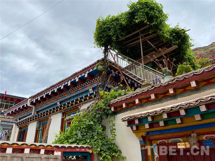 正欲轉身,忽然發現身旁門楣上鑲嵌著兩個小鐵牌,一個是黃底紅字,上面寫著“共產黨員戶”;一個是藍底白字,上面寫著“平安家庭”。毫無疑問,這家戶主是一名共產黨員。這徹底改變了之前留在腦中的農牧區共產黨員形象。百年藏寨中的黨員,在家窗明幾凈綠樹紅花葡萄架,出外精神抖擻干事創業群眾夸。