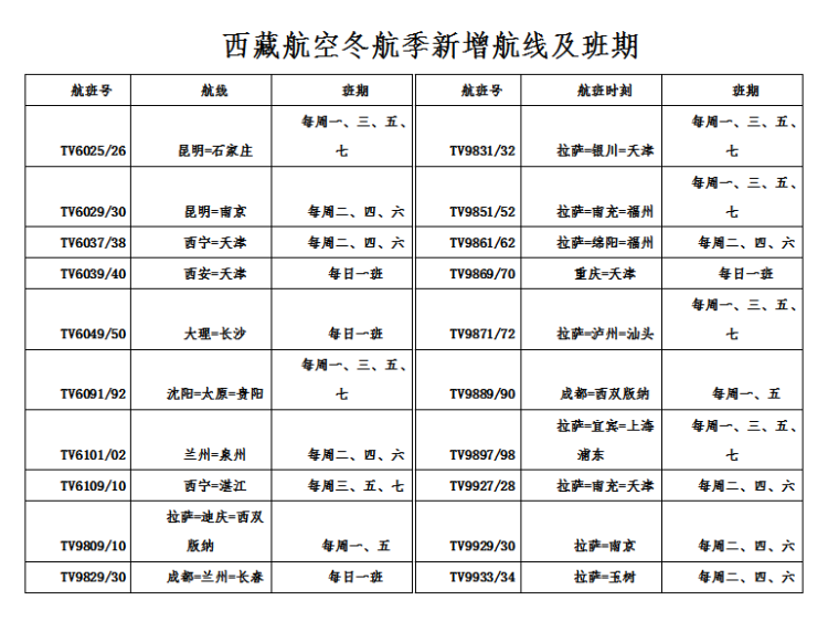 中國西藏網訊 10月25日,西藏航空將正式進入冬航季。在今年的冬航季,西藏航空在原有航線網絡布局的基礎上進行了優化調整,新開拉薩—南京、拉薩—宜賓—上海浦東、成都—西雙版納等20條國內航線(新開航線及班期詳見表格)。